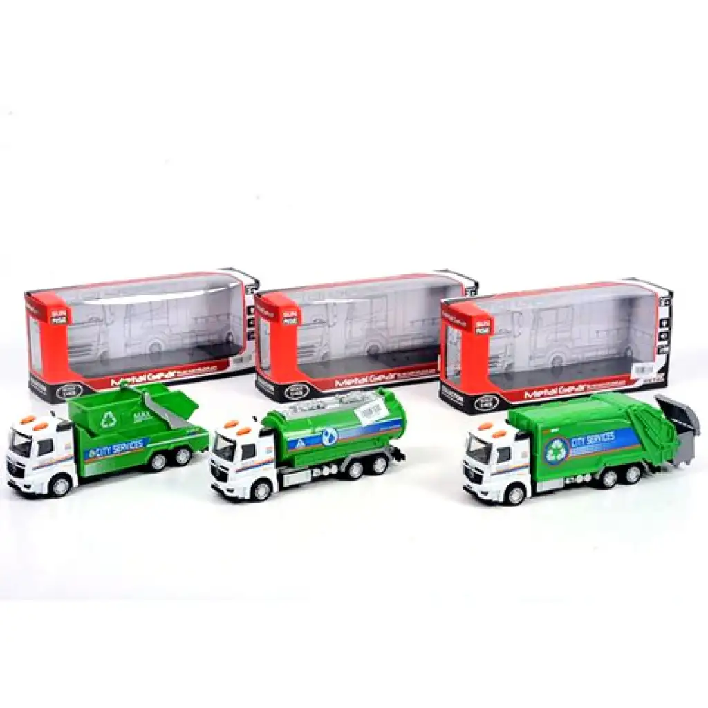 A városokat irányító hivatalok kénytelenek fenntartani olyan járműflottát, ami a mindennapi feladatokat képes ellátni. Ezek közül az egyik legfontosabb a szervezett szemétszállítás, így két ilyen kocsi közül is lehet választani, az egyik konténeres, míg a másik a kukás szemetet képes kezelni, a harmadik járgány pedig a hatalmas tartályával ivóvizet tud szállítani, ha szükséges. A több mint tizenöt centiméteres kisautók rendkívül részletgazdag kidolgozást kaptak, amihez a jellegzetes festés is dukál, ráadásul fény és hang hatásokkal teszi még izgalmasabbá a játékot a gyerekek számára.