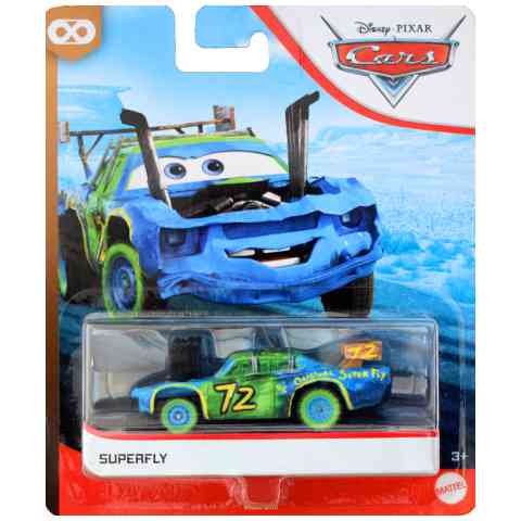 Superfly nem egy hétköznapi versenyautó, hiszen nem a rangos futamokon vagy a Szelep-kupában szokott rajthoz állni, hanem a roncsderbin, ahová a Verdák3 mesében Villám McQueen és Cruz Ramirez is eljutott. Superfly egy rozzant kocsi, ami egykor egy igen komoly izomautó lehetett. A kisautó a részletgazdag kidolgozásának, festésének és mintázatának köszönhetően pont úgy néz ki, ahogy a Verdák című Disney mesefilmekben, így a velük való játék vissza adja a mese hangulatát, és felidézi a szereplők legizgalmasabb kalandjait.