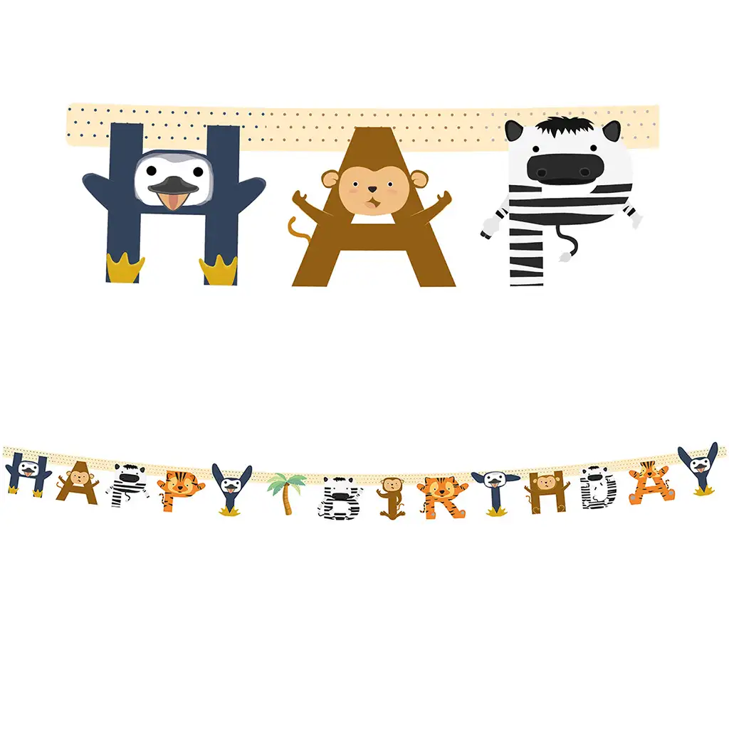 Ez a mókás és színes Vidám állatos szülinapi banner tökéletes választás, ha szeretnél egy vidám hangulatú, állatos tematikájú születésnapi dekorációt! A "Happy Birthday" felirat betűit aranyos dzsungel- és szavannaállatok díszítik – köztük pingvin, majom, zebra, tigris és még sok más barátságos figura, akiket a gyerekek biztosan imádni fognak.