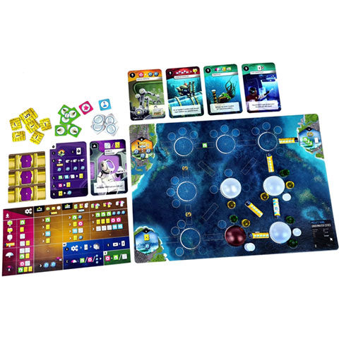 A Vízalatti városok társasjáték játékosonként körülbelül 30-45 percig tart, és a játékosok a világ legzseniálisabb elméit képviselik, akik a Föld túlnépesedése miatt a lehető legjobb és legélhetőbb víz alatti városokat igyekeznek létrehozni. A játék fő mechnikája a kártyák elhelyezése. Három színben kell kártyát elhelyezni a főtáblán egy 3 x 5ös mezőben, amelyek szintén színesek. Ideális esetben a játékosok azonos színű helyekre helyezhetnek kártyákat. Ilyenkor akciókat és előnyöket is igénybe vehetnek. A főtáblán lévő területen ábrázolt akciót, illetve a kártya előnyét. Az akciók és az előnyök lehetővé tehetik a játékosok számára, hogy nyersanyagokhoz jussanak, hogy városkupolákat, alagutakat és termelési épületeket, például farmokat, sótalanító berendezéseket és laboratóriumokat építsenek és fejlesszenek a személyes víz alatti területükön, hogy a kezdeményezési sávon áthelyezzék a jelzőjüket, hogy aktiválják a játékos "A-kártyáit", és hogy kártyákat gyűjtsenek, különleges és alapkártyákat egyaránt, amelyek jobb döntési lehetőségeket biztosítanak a játék során. A közel 220 kártya mindegy, hogy különleges vagy alapkártya, a felhasználás módja és ideje szerint öt típusba sorolható így a játékosoknek elég so lehetősége nyílik a győzelmi pontok szerzésére.