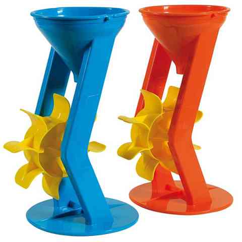 Ez a malom remekül megmutatja, hogyan lehet munkára bírni a víz erejét. A kerek talpon stabilan megálló malom felső része tölcsérszerű kialakítást kapott, így könnyedén fel tudod tölteni vízzel vagy nagyon finom szerkezetű száraz homokkal. Ahogy a tölcséren keresztül a víz vagy a homok a lapátokra folyik, a kerék elkezd forogni. A forgó kerék egészen lenyűgözi a gyerekeket, és egyúttal szemléletesen el tudjuk magyarázni a hasonló elven alapuló malom vagy turbina működését.