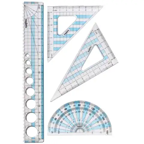Ez a vonalzó készlet a legszükségesebb vonalzókat tartalmazza, ráadásul a praktikus méretének köszönhetően minden iskolai felszerelésnek a leghasznosabb kiegészítője lehet. A vonalzók kellőképp merev és áttetsző anyagból készültet, így ellenállók és a legfeljebb húsz centiméteres méretük miatt a legtöbb tolltartóban kényelmesen elférnek, ráadásul az egyenes vonalzón lévő körsablonok segítségével a rádiusz készítés is jelentősen könnyebb feladat. A készletben egy egyenes, két háromszögű vonalzó is helyet kapott, illetve egy szögmérő is a készlet része, így már minden szerkesztés elvégezhető a segítségükkel.