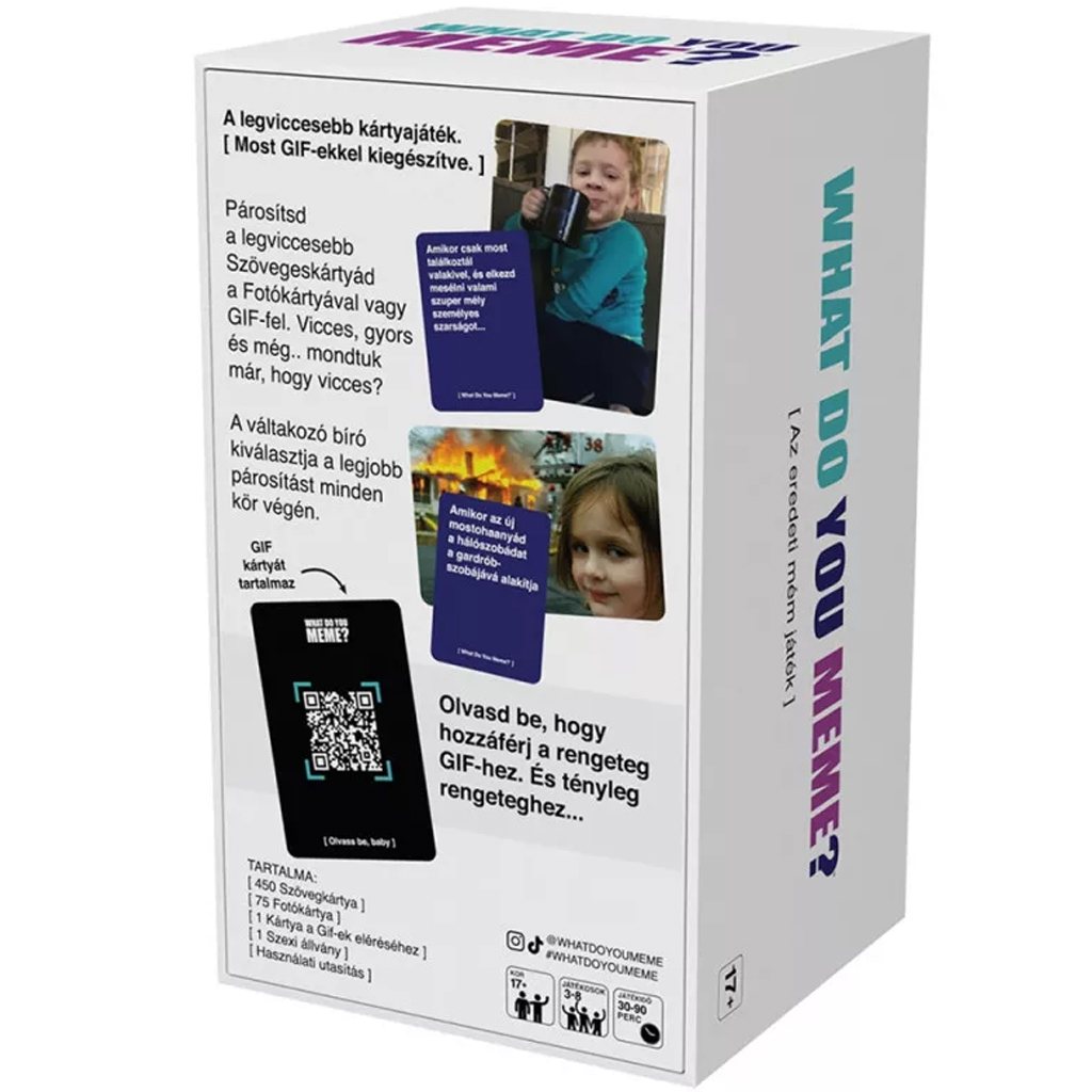 A What Do You Meme? – GIF Edition egy szórakoztató, kreatív társasjáték felnőtteknek, amelyben a nevetésé a főszerep. A játék célja, hogy vicces szövegkártyákat párosíts a megadott fotókhoz vagy mozgó GIF-ekhez. A játékosok minden körben kiválasztanak egy-egy szövegkártyát, amit egy képpel vagy GIF-fel kell összepárosítani úgy, hogy az a lehető legviccesebb legyen. A kör bírója dönti el, kié lett a legjobb kombináció, és az kap pontot.