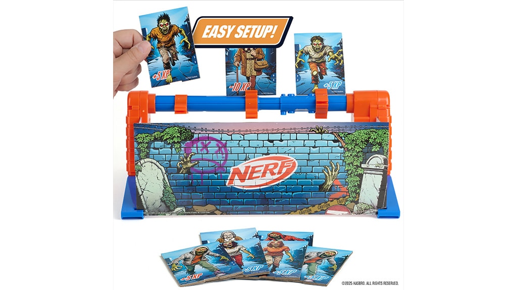 A gyerekek megpróbálják lelőni a pörgő zombi célpontokat, minden egyes zombi eltalálásáért öt pontot szerezhetnek. Azonban, ha véletlenül Granny kártyákat találnak el, tíz pontot veszítenek. A kártyák találat esetén szétesnek, így a pontszámok könnyen követhetők. A NERF kilövők és a habszivacs lövedékek külön vásárolhatók meg. Ez a játék izgalmas kihívást jelent a gyerekeknek, miközben fejleszti a célzókészséget és a pontosságot. Remek szórakozás barátokkal vagy családdal, akár versenyt is rendezhettek, hogy ki gyűjti a legtöbb pontot!