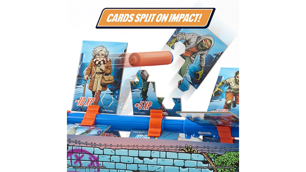 A Zombie kártyák kétoldalasak: az egyik oldaluk piros, a másik kék, így a gyerekek egyedül vagy barátaikkal is játszhatnak, és versenyezhetnek egymással a pontokért. Minden Zombie kártya 5 pontot ér, de vigyázni kell a Granny kártyával – ha azt találja el valaki, 10 pontot veszít! Ez a játék nemcsak szórakoztató, hanem fejleszti a célzást, a gyorsaságot és a versenyszellemet is, így tökéletes választás minden NERF-rajongó számára.